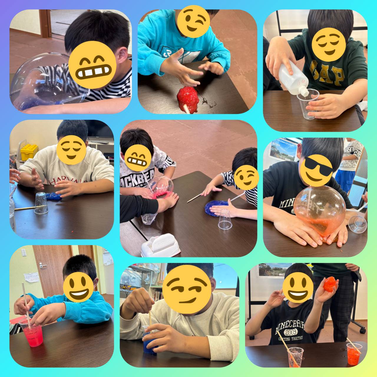 素になる液体💧を作り自分の好きな色🎨を加えて混ぜる!🫧🌀 スライムにストローで空気を入れて膨らませたり🎈、感触✋を楽しんでいたりと楽しそうに作って遊んでいました!😉✨ 誰が一番大きく膨らませる事ができたかな⁉😮‍💨